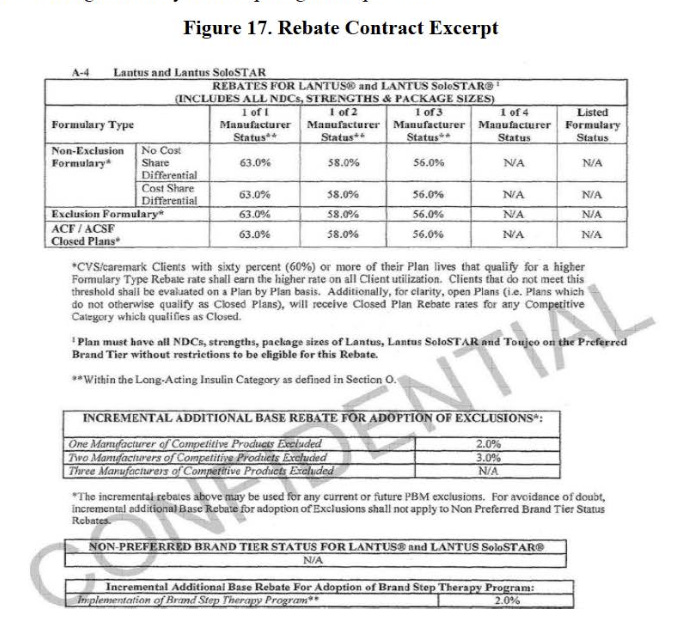 The mechanism PBMs use to foster these different prices is something called a rebate. An insurer will “pay” the list price of a drug, say, insulin. But then the PBM will negotiate a rebate from the pharmaceutical company of something between 40-65% of that list price. Here, for instance, is an old rebate contract for Sanofi’s Lantus, a popular branded insulin. Sanofi has to pay a 63% rebate to one of the big three PBMs, CVS Caremark, in return for which Lantus is the only insulin offered to Caremark customers.