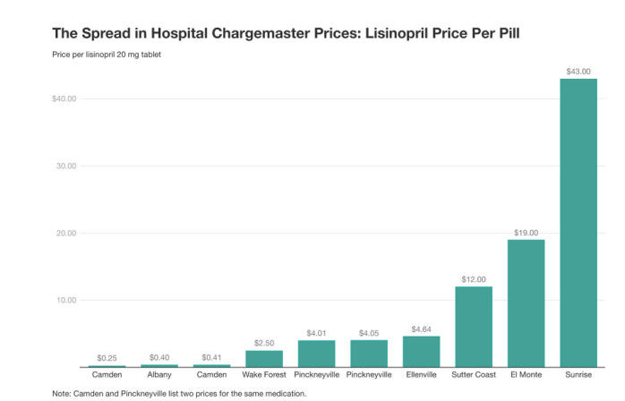 Obamacare was passed in 2010. Fourteen years later, in 2024, the Government Accountability Office reported that hospitals are still not fully releasing chargemaster lists. And even if they did adhere, the legal requirement is only for list prices, not actual prices after various rebates. The result is what you’d expect. Here’s a chart of what different hospitals give as their list prices for Lisinopril, a heart medication.